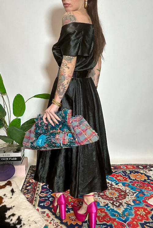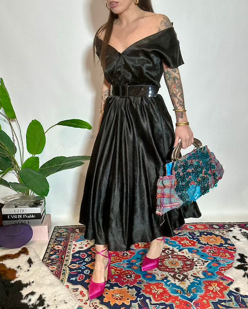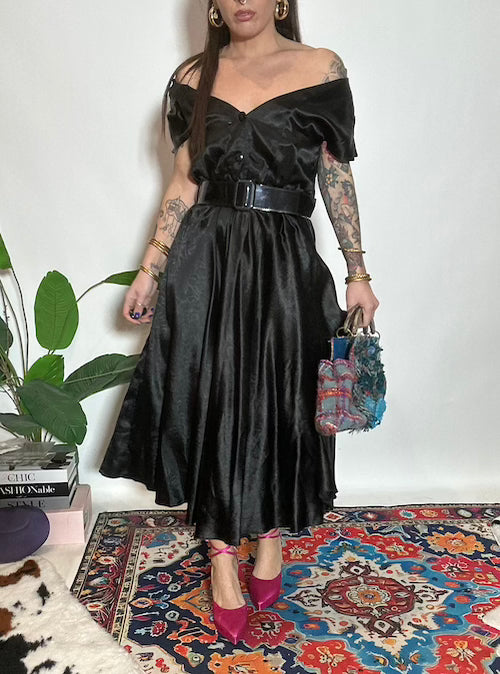 Abito in raso off-shoulder in raso nero lunghezza midi e gonna a ruota.
