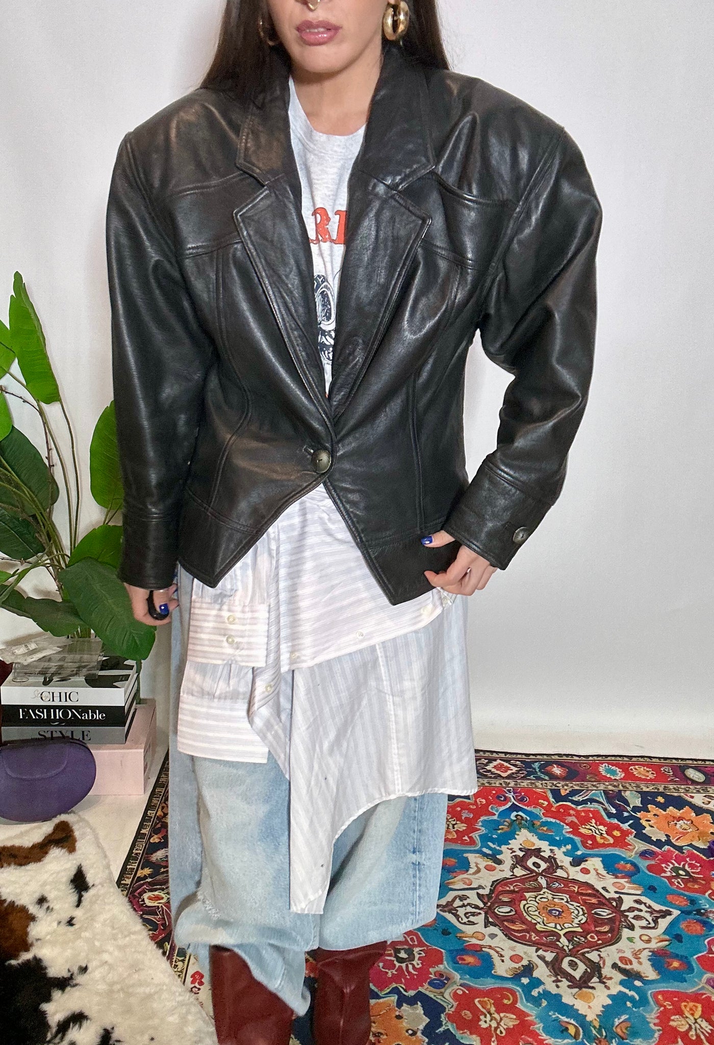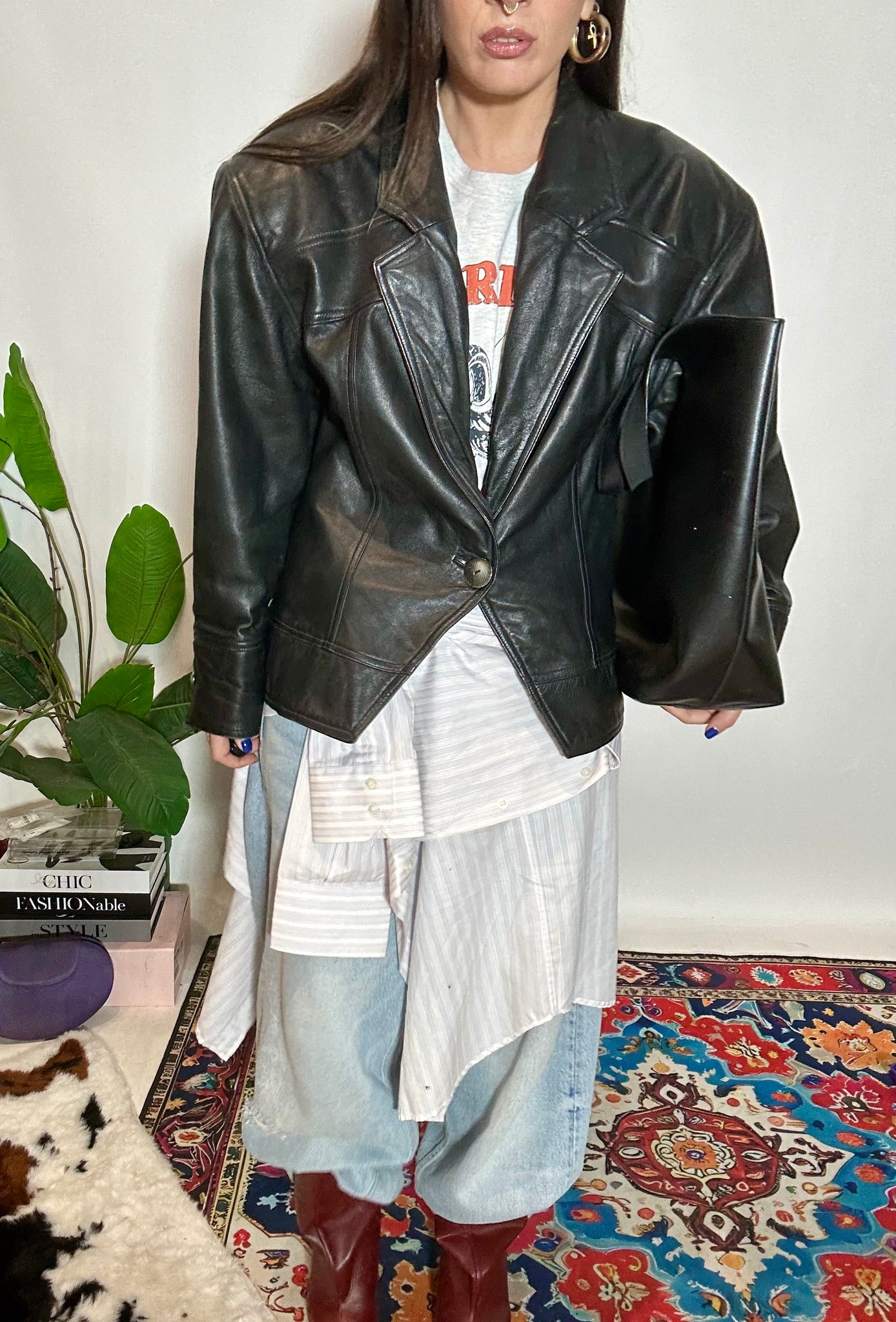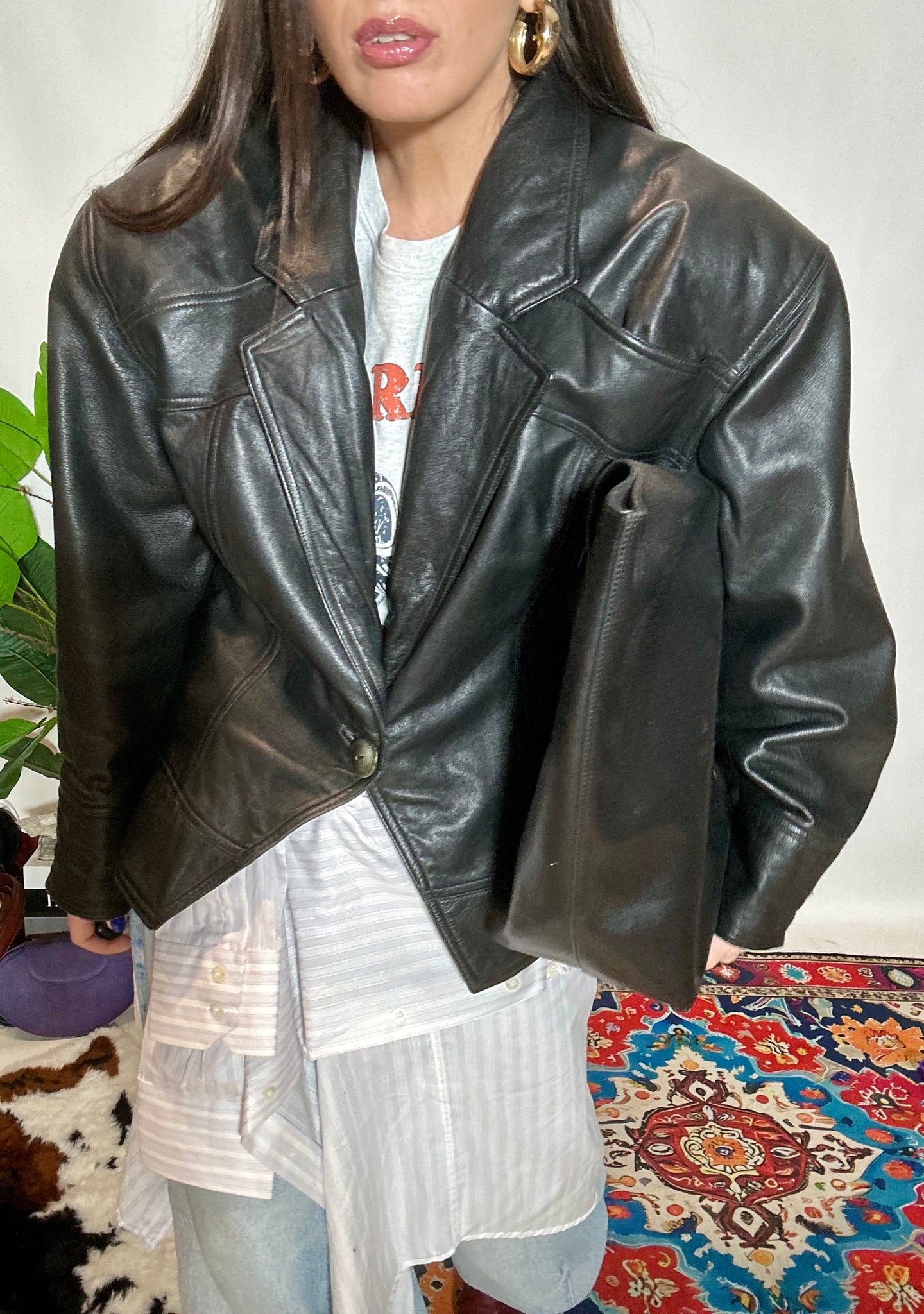 Giacca monopetto in vera pelle vestibilita' oversize con maxi spalline.