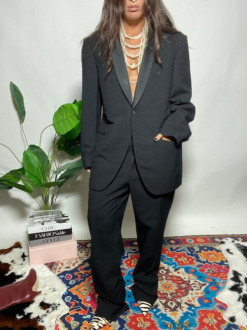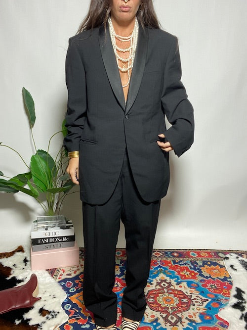 Tailleur in fresco lana con smoking monopetto vestibilita' oversize e pantalone vita regular taglio maschile gamba larga