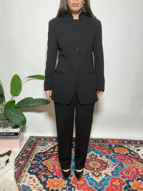 Tailleur Giorgio Armani nero in fresco lana , un capolavoro di eleganza senza tempo. Taglio impeccabile e struttura raffinata caratterizzano questo pezzo vintage che incarna lo stile inconfondibile della maison milanese. Perfetto per chi ricerca eleganza e qualità artigianale. Ideale per occasioni formali o per chi apprezza l'haute couture d'epoca. Un investimento nel vero lusso vintage.