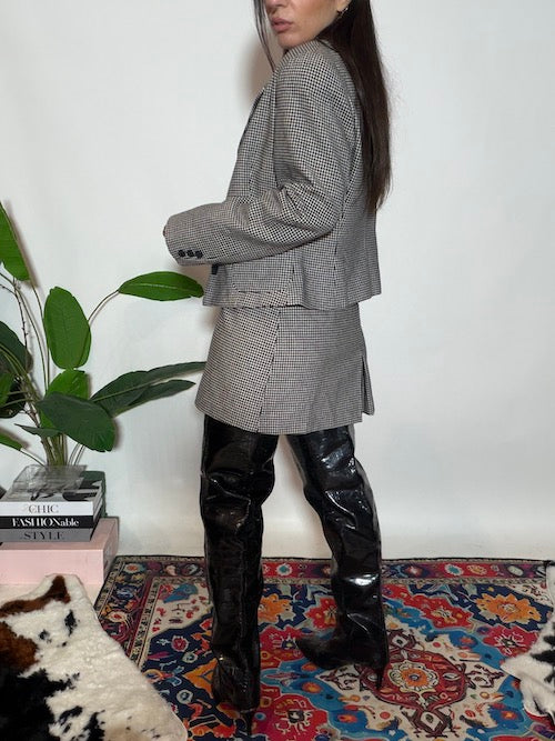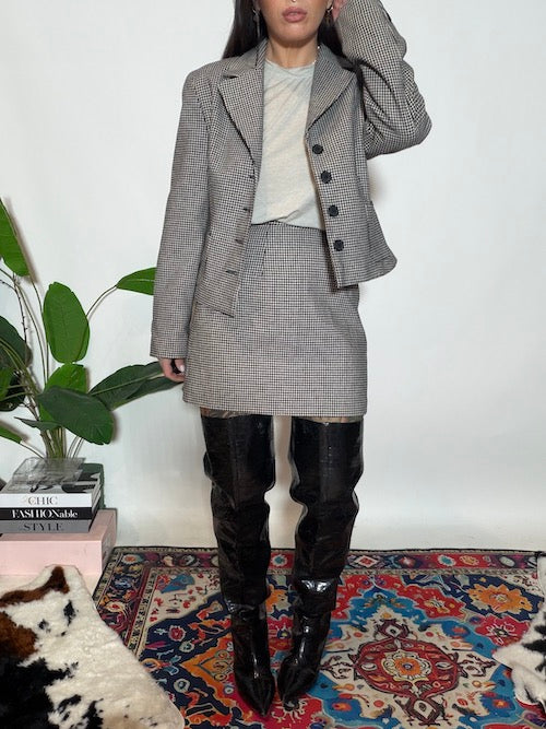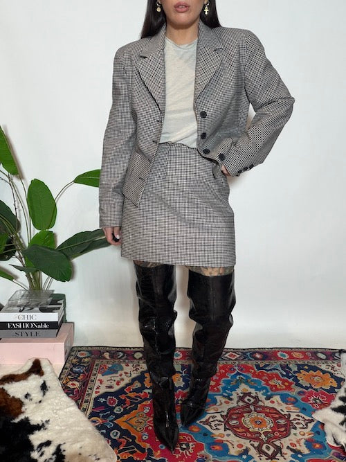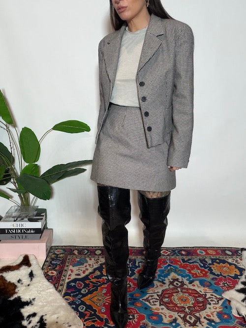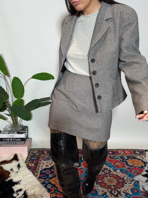 Tailleur in pura lana con giacca monopetto in piede de pule vestibilita' oversize con spalline e mini gonna vita alta svasata.