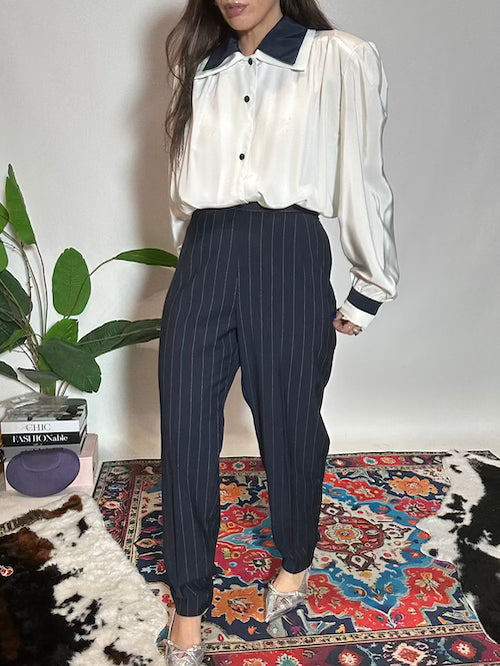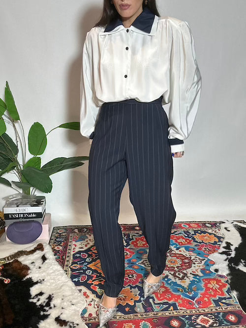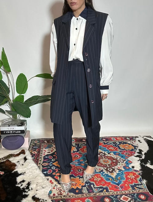 Tailleur composto da gilet lungo monopetto in viscosa e lana pantalone taglio carota vita alta gamba larga stretto alla caviglia e camicia in viscosa vestibilita' oversize con spalline in un meraviglioso blu navi gessato